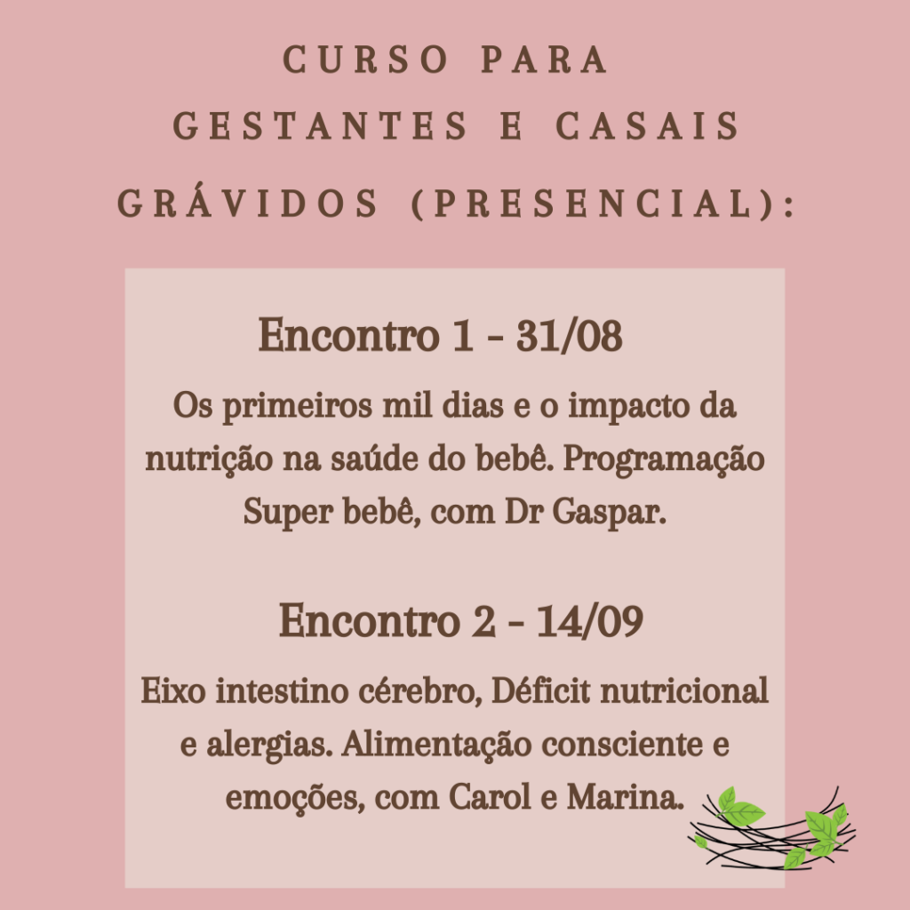 O curso preparatório para gestantes e casais grávidos, presencial e temático (sempre aos sábados), com toda riqueza de interação humana que esta fase da vida merece. Nesses encontros serão oferecidos cafés da manhã pela nutricionista Marina Guglielmo, com as melhores receitas para a dieta das gestantes.