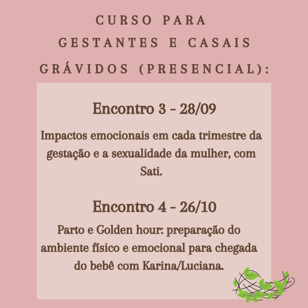 O acompanhamento psicológico envolverá práticas de escuta, comunicação não-violenta, auto-compaixão, respiração para regular as emoções e abordagem para lidar com ansiedade, medos e traumas, bem como técnicas do psicodrama, das abordagens corporais e sistêmicas e da contoterapia. Além disso, no Plano 4) Combo Plus, você contará com 4 sessões individuais com a psicóloga Carol Porto (sendo 3 na gestação – uma por trimestre e 1 sessão até 6 meses após o parto).
