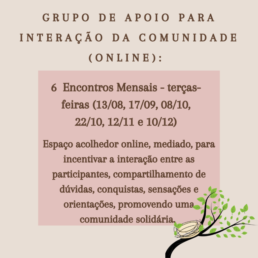 Ainda poderá, se quiser, fazer parte do Grupo de Apoio, que será Online, com um encontro por mês.